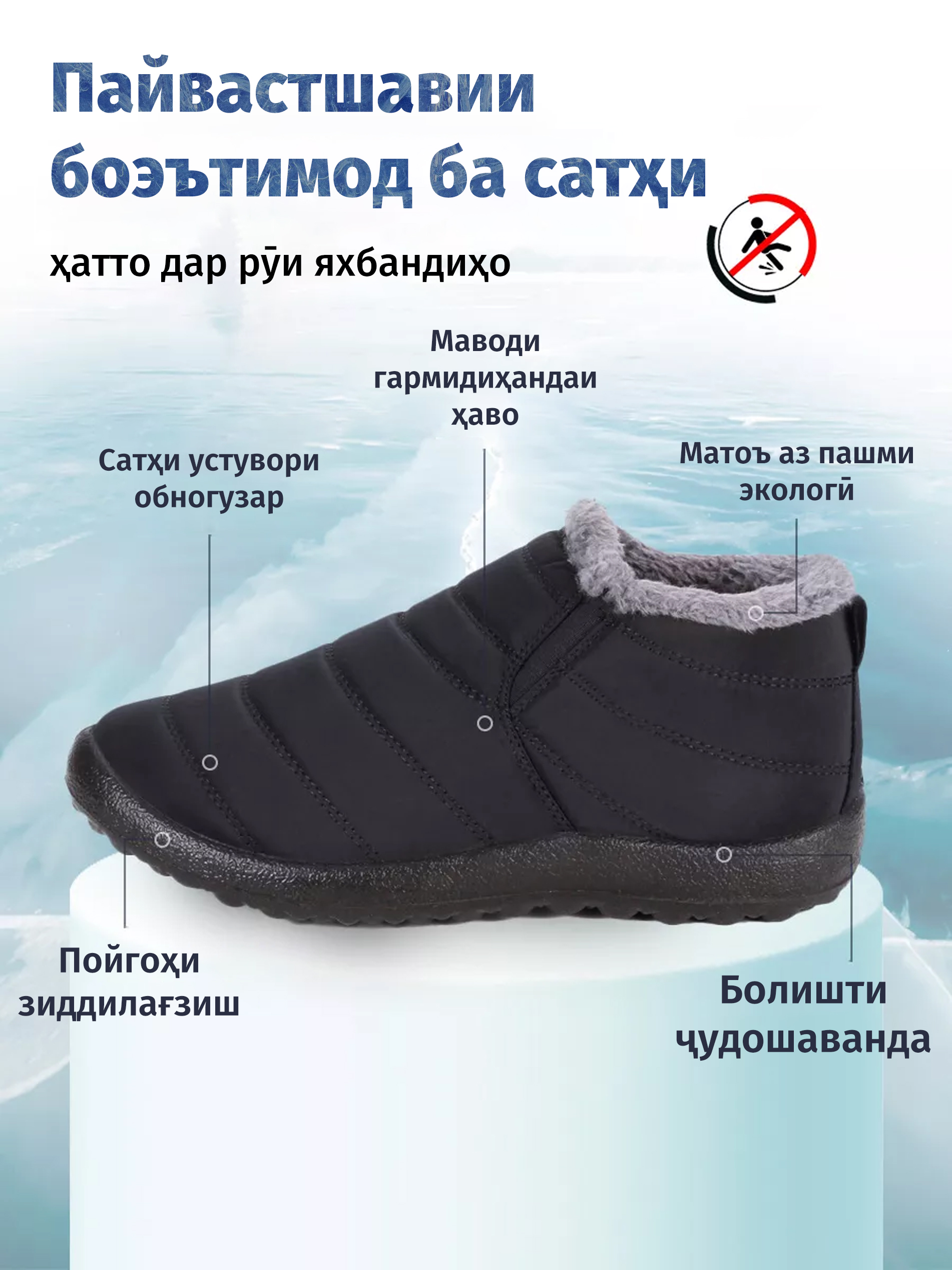 Пойафзолҳои зимистонаи обногузар як модели универсалӣ барои ҳам занон ва ҳам мардон мувофиқанд. Ин интихоби беҳтарин барои рӯзҳои сарди зимистон барои нигоҳ доштани гармии ҳадди аксар аст. Тарҳрезии он бешубҳа ба шумо гармии лозимаро дар вақти лозима таъмин мекунад ва шумо ҳеҷ гоҳ худро сард ҳис намекунед!